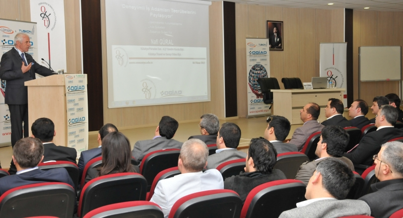 Osmaniye Girişimci İşadamları Derneği (OGİAD) tarafından OKÜ’nün ev sahipliğinde gerçekleştirilen ‘’ Deneyimli İş Adamları Tecrübelerini Paylaşıyor’’ başlıklı program için Osmaniye’ye gelen Kütahya Porselen San. A.Ş. Yönetim Kurulu Başkanı, Kütahya Ticaret ve Sanayi Odası Başkanı Nafi Güral, İşletmelerde Kurumsallaşma, Aile Şirketleri ve Başarıya Giden Yol hakkında tecrübelerini anlattı.